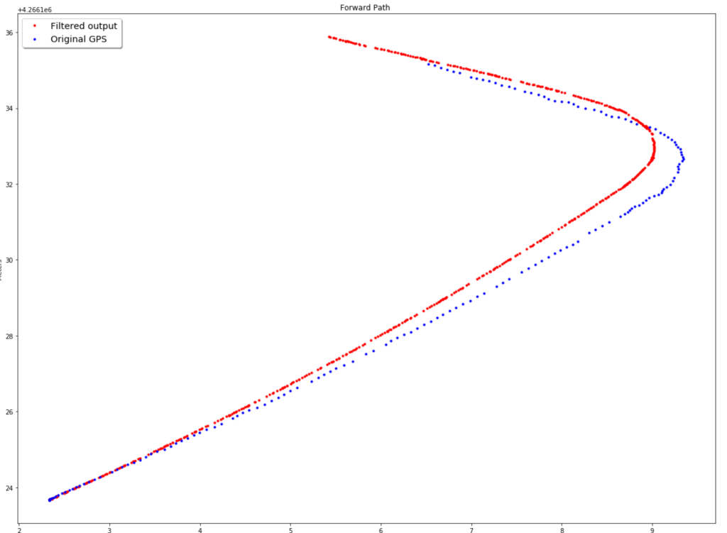 The example below shows a path segment traversed by our robot. The blue path shows the GPS output and the red path is the “Dead Reckoning” result using only wheel odometry and IMUs that drift over time. My current solution fuses the GPS, wheel odometry, and IMUs for a state estimation that is more robust to signal occlusion and sensor noise.